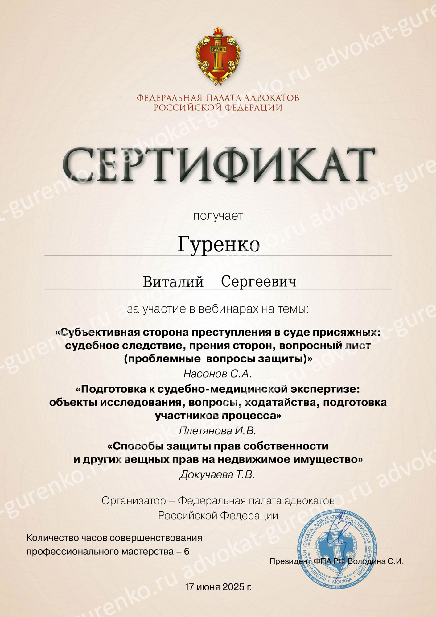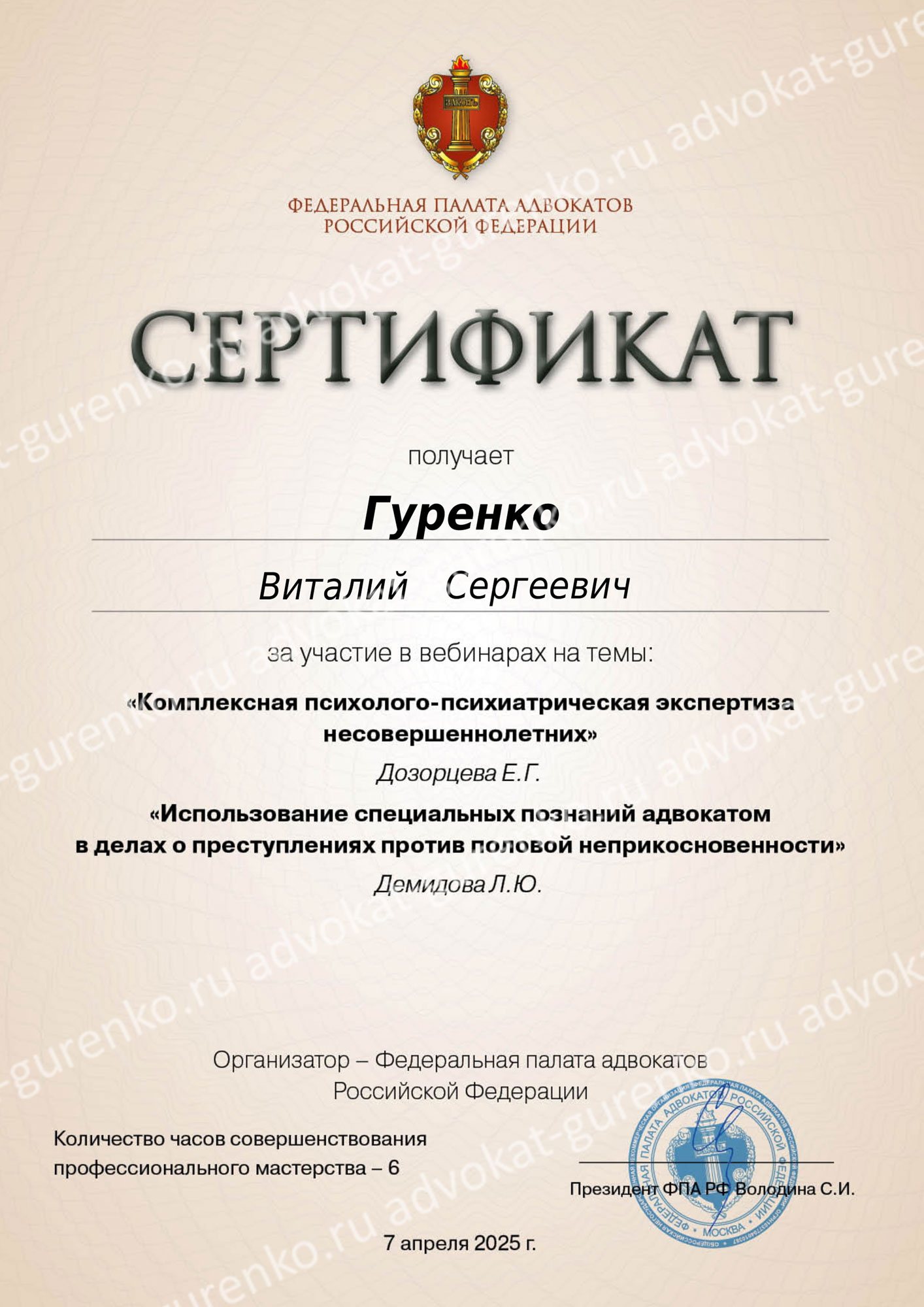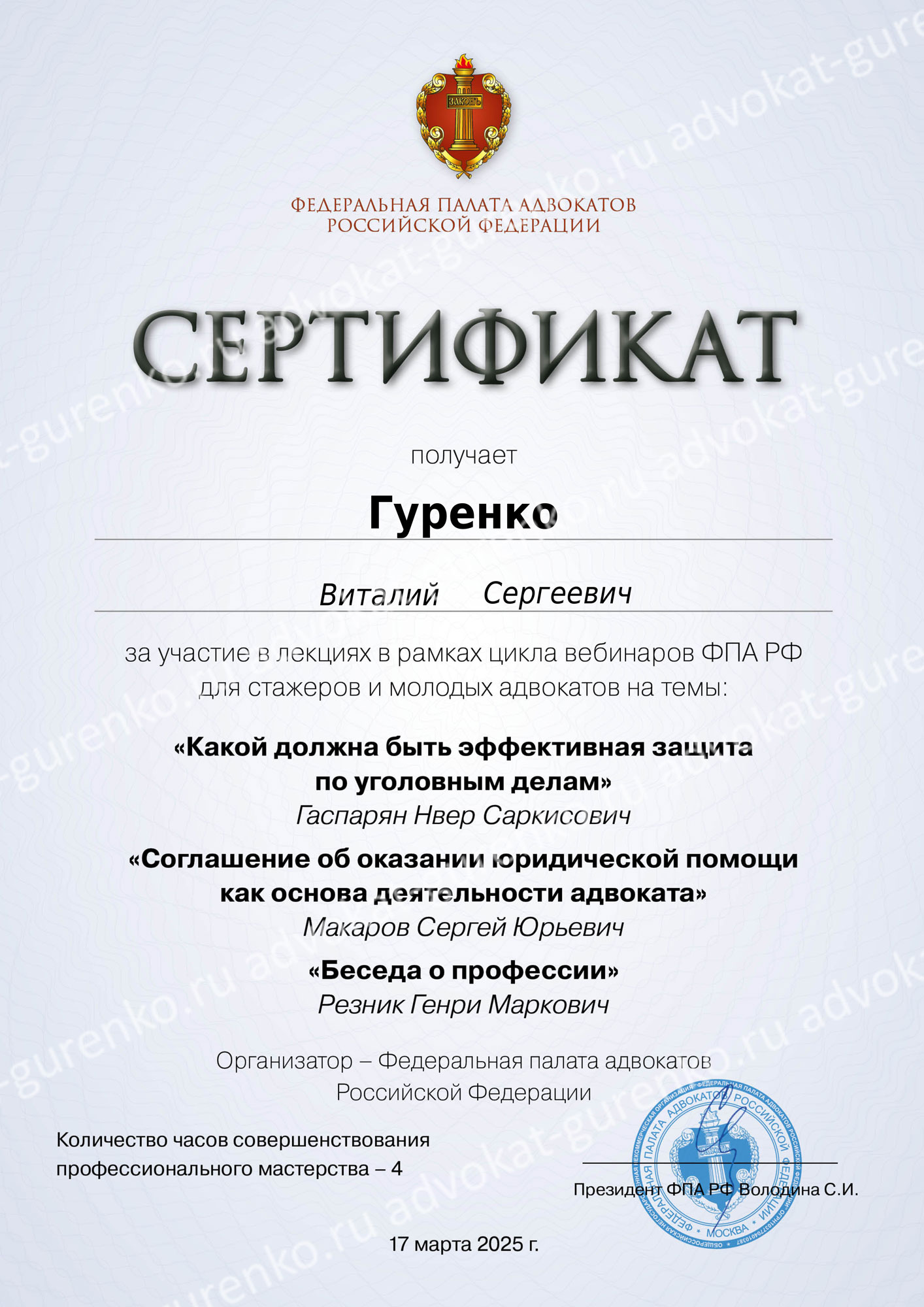 ГУРЕНКО ВИТАЛИЙ СЕРГЕЕВИЧ — адвокат Адвокатской палаты Красноярского края, состоит в адвокатском образовании — Красноярская краевая коллегия адвокатов «Содружество», регистрационный номер в реестре адвокатов Красноярского края — 24/1240, удостоверение адвоката — 2644 от 14.08.2025 (выдано взамен 1481 от 17.06.2010 года). Опыт успешной защиты по уголовным и гражданским делам более 15 лет.