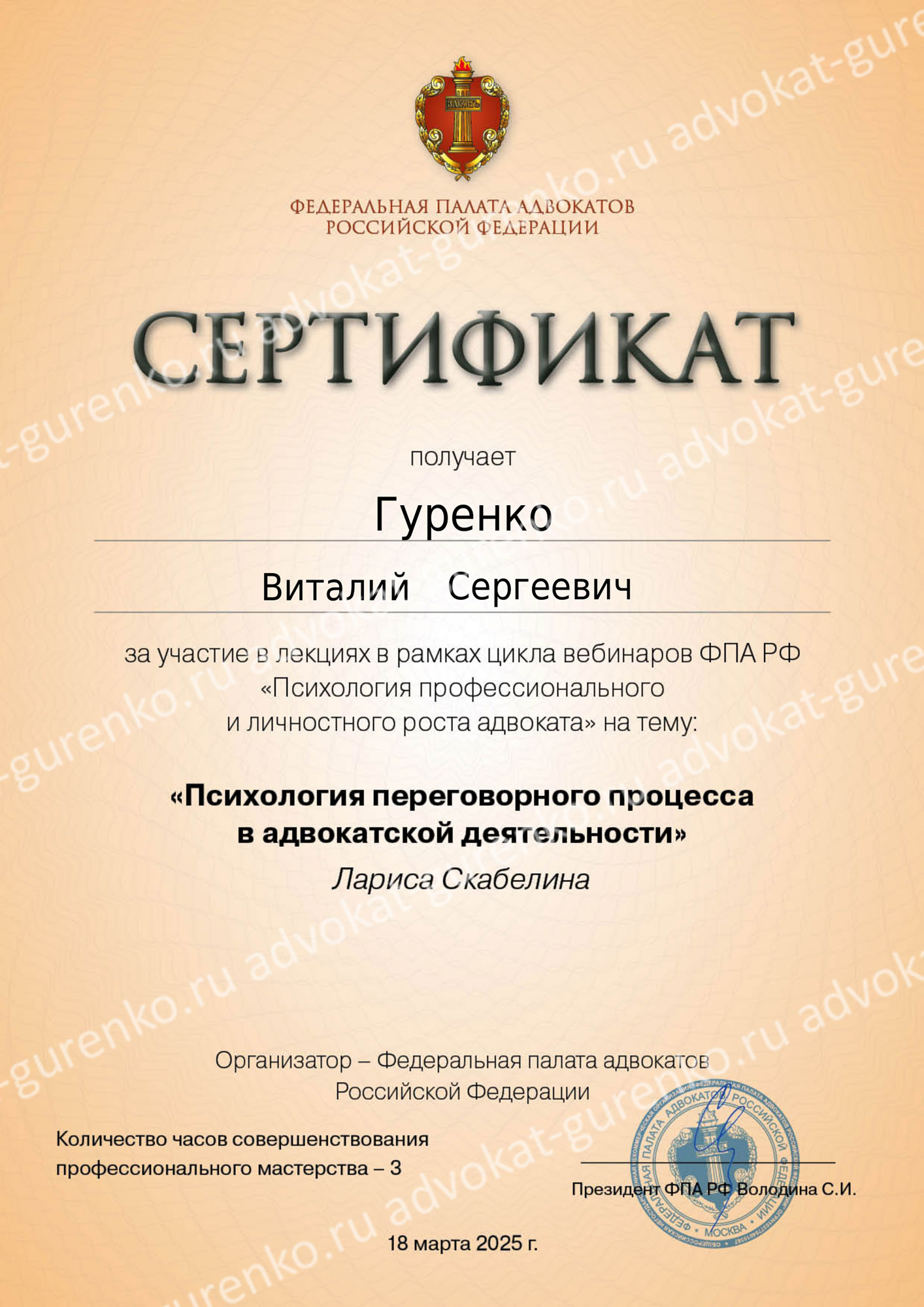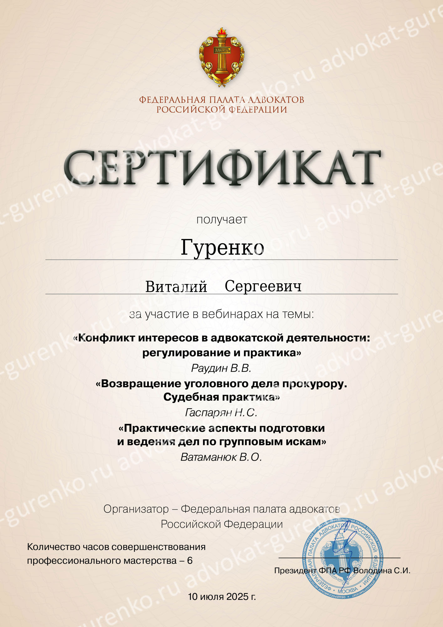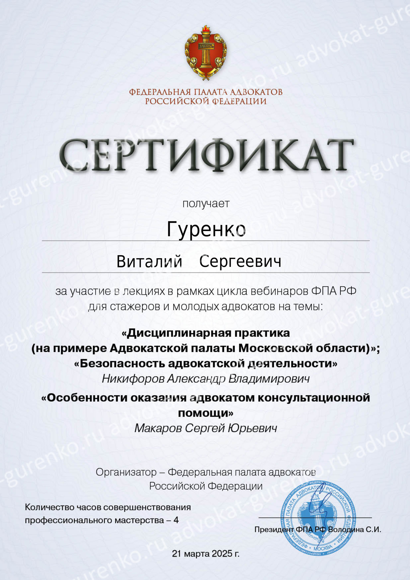 ГУРЕНКО ВИТАЛИЙ СЕРГЕЕВИЧ — адвокат Адвокатской палаты Красноярского края, состоит в адвокатском образовании — Красноярская краевая коллегия адвокатов «Содружество», регистрационный номер в реестре адвокатов Красноярского края — 24/1240, удостоверение адвоката — 2644 от 14.08.2025 (выдано взамен 1481 от 17.06.2010 года). Опыт успешной защиты по уголовным и гражданским делам более 15 лет.